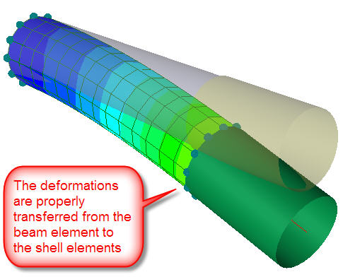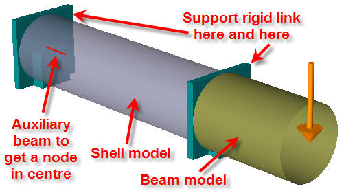In this example a beam (pipe) has been partly modelled using shell elements and partly using a beam element. The coupling between the shell elements and the beam element is modelled using the rigid support link functionality of GeniE. This involves linear coupling of the shell element nodes to a midnode. Note that the boundary condition of the midnode of the rigid support link is 6 times free as it is not going to be fixed. To fix the other end of the shell model another rigid support link is used. As such rigid support link requires a midnode an auxiliary beam is inserted just to get a node.